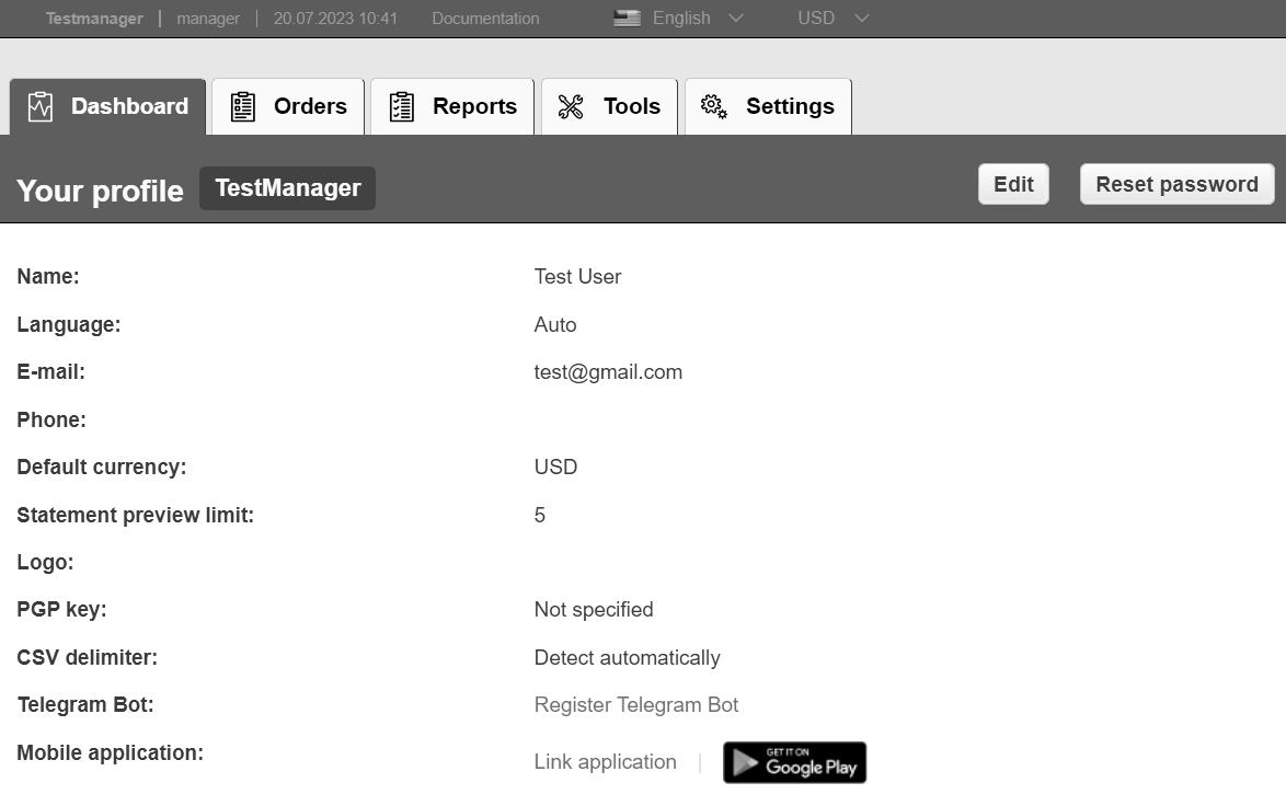 Manager employees can browse transactions, configure processing solutions and download various reports via AlbionPay UI. It is available at https://gate.albionpay.com/paynet-ui/ for production environment and at https://sandbox.albionpay.com/paynet-ui/ for sandbox environment.