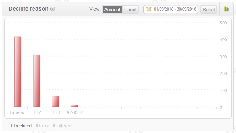 This statistics screen can be used for a visual assessment of the most frequent decline reasons, as well as chargeback and fraud reasons.