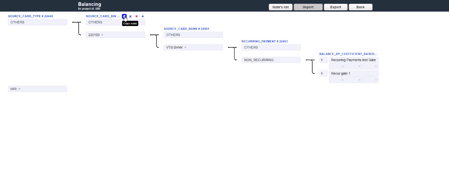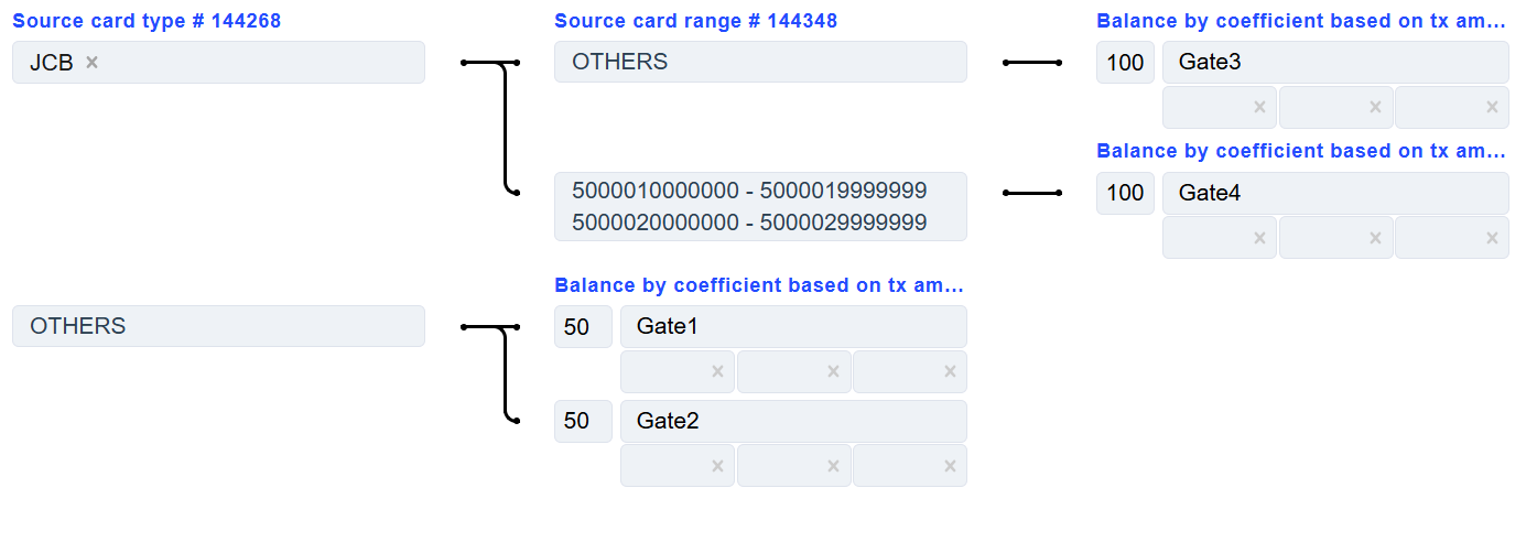 There is already an “OTHERS” default criterion below. As in the first case, click the Add routing row to add the appropriate criterion. Depending on the required routing strategy and the traffic separation level, go on building the routes or finish the route by adding one of the Balancing types and clicking Add balancing row to add the payment gate. The final configuration might look as the following: