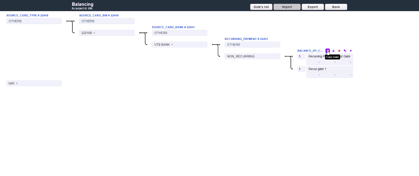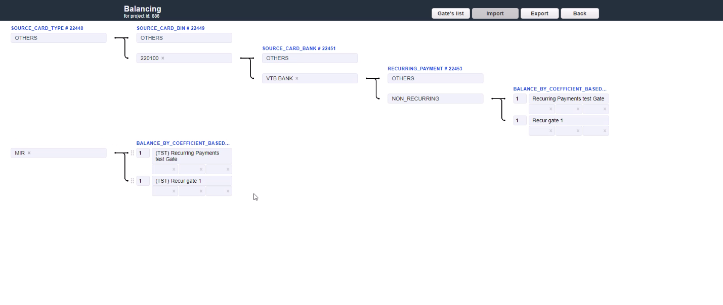 The routing & balancing system allows to distribute traffic between payment gates flexibly depending on the defined criteria and customer’s transaction data. Traffic can be routed to a specific group of gates/processors and distributed between them in accordance with the specified balancing. The balancing is configured on the system Project level in the Routing & Balancing tab.