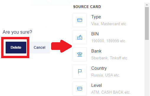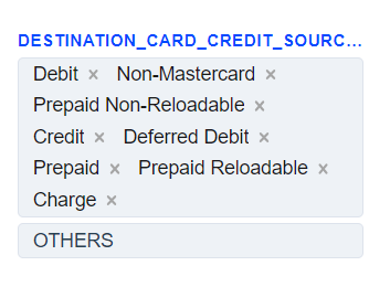 1. The Destination Card Credit Source routing type allows to sort transactions by the receiver’s card type. Select the needed card types of the receiver and build a further route based on them.