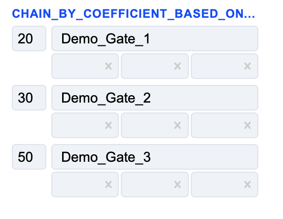 • Probability percentage - far left field. This percentage determines how likely the transaction is to go to this gate. This field exists only for balancing types with a specified coefficient.