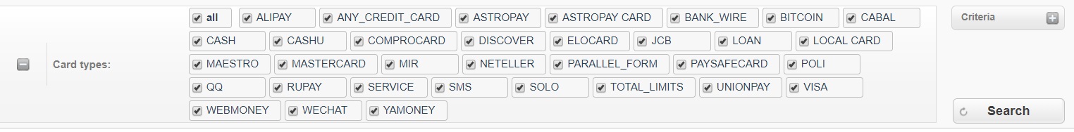 Currencies, payment methods, as well as endpoints, projects and other data can be specified for analysis. Here is the example of the payment method selection to construct the chart: